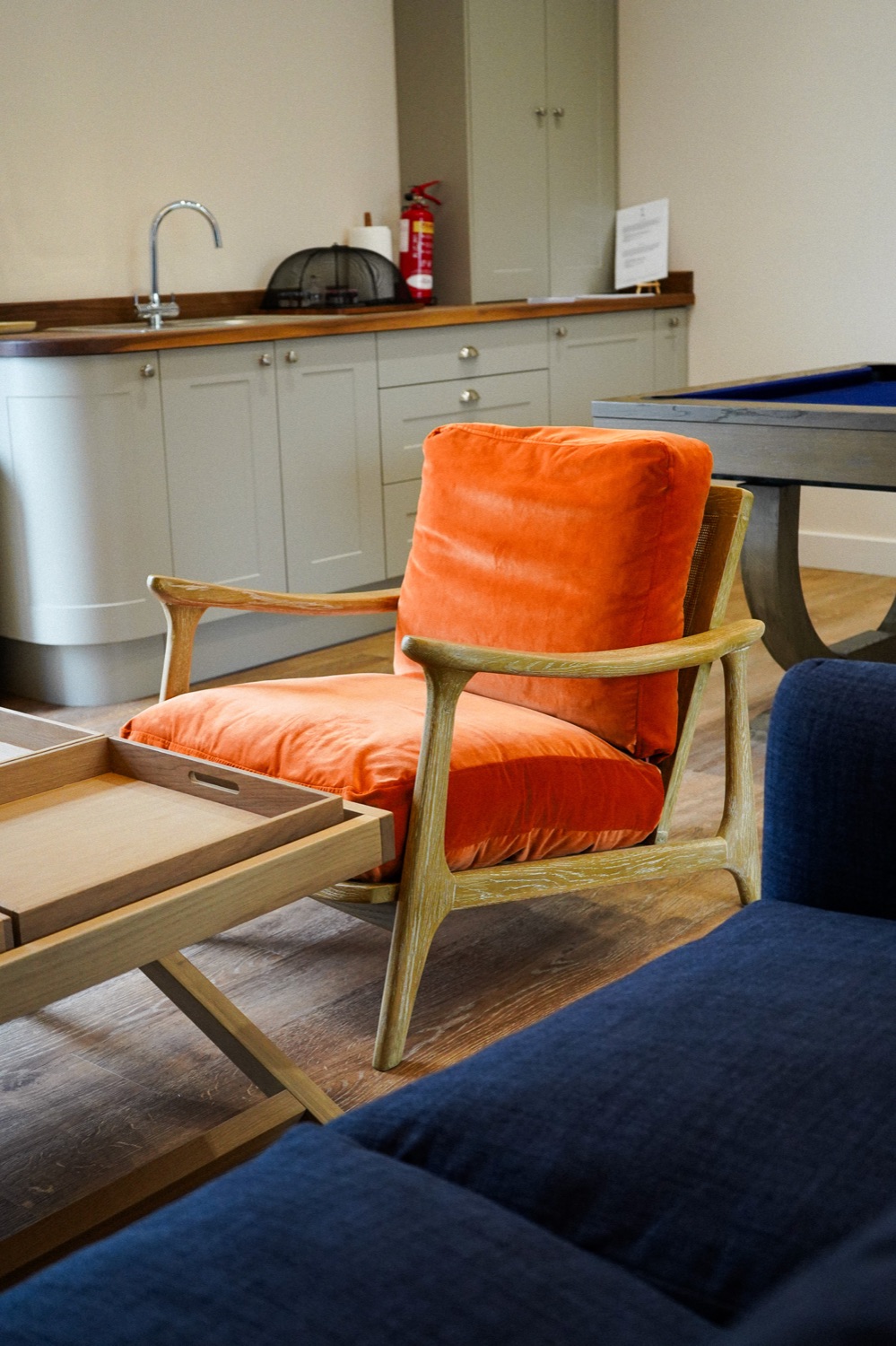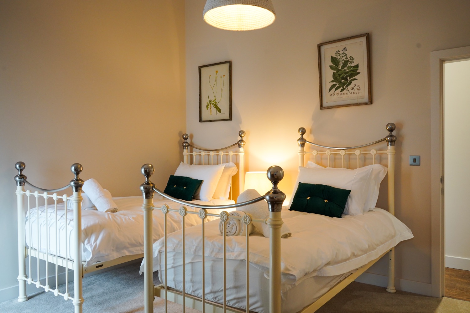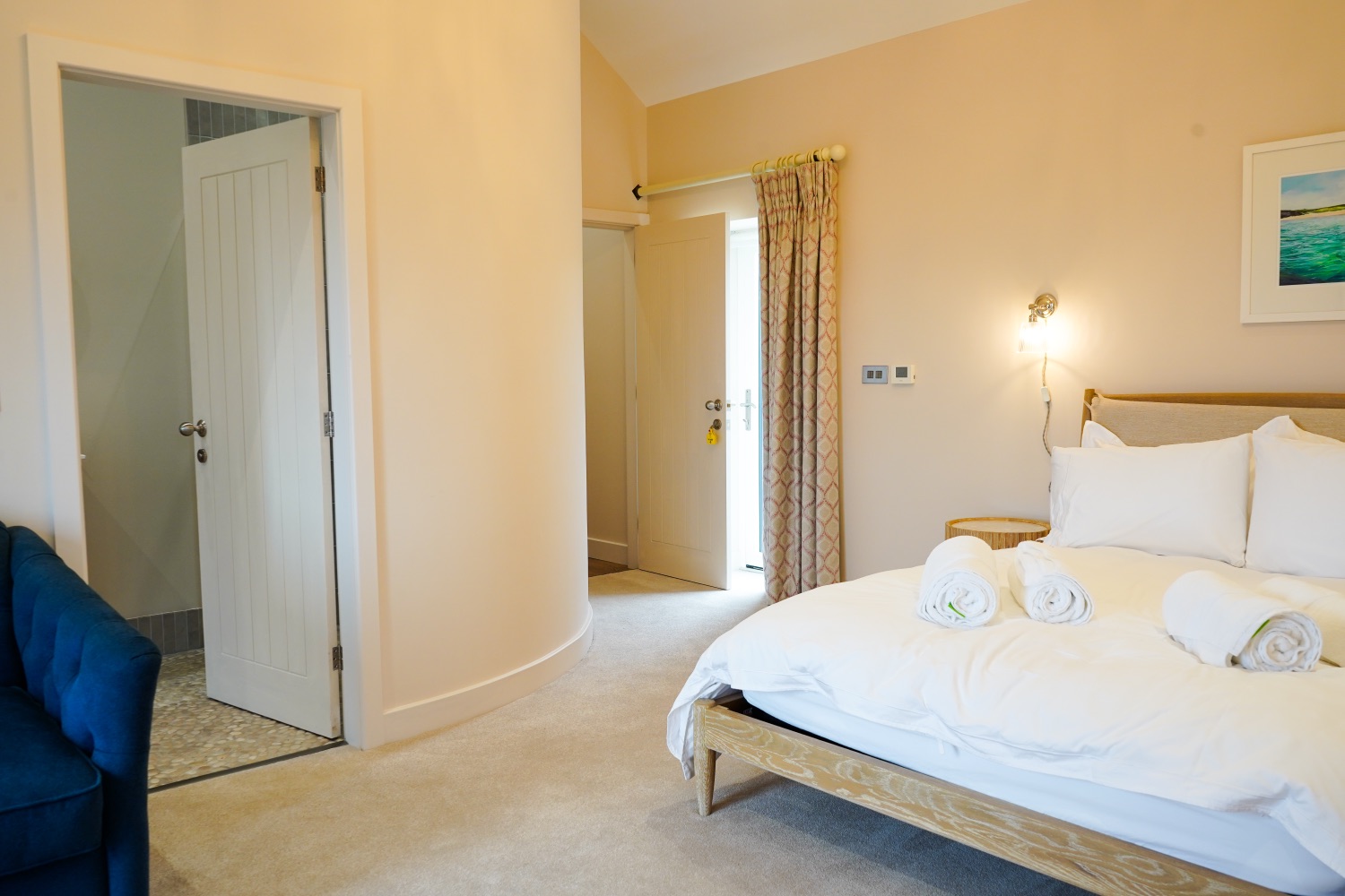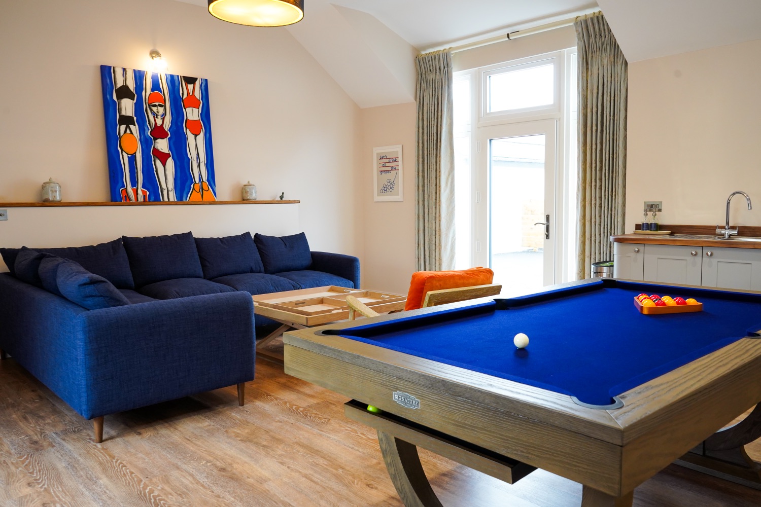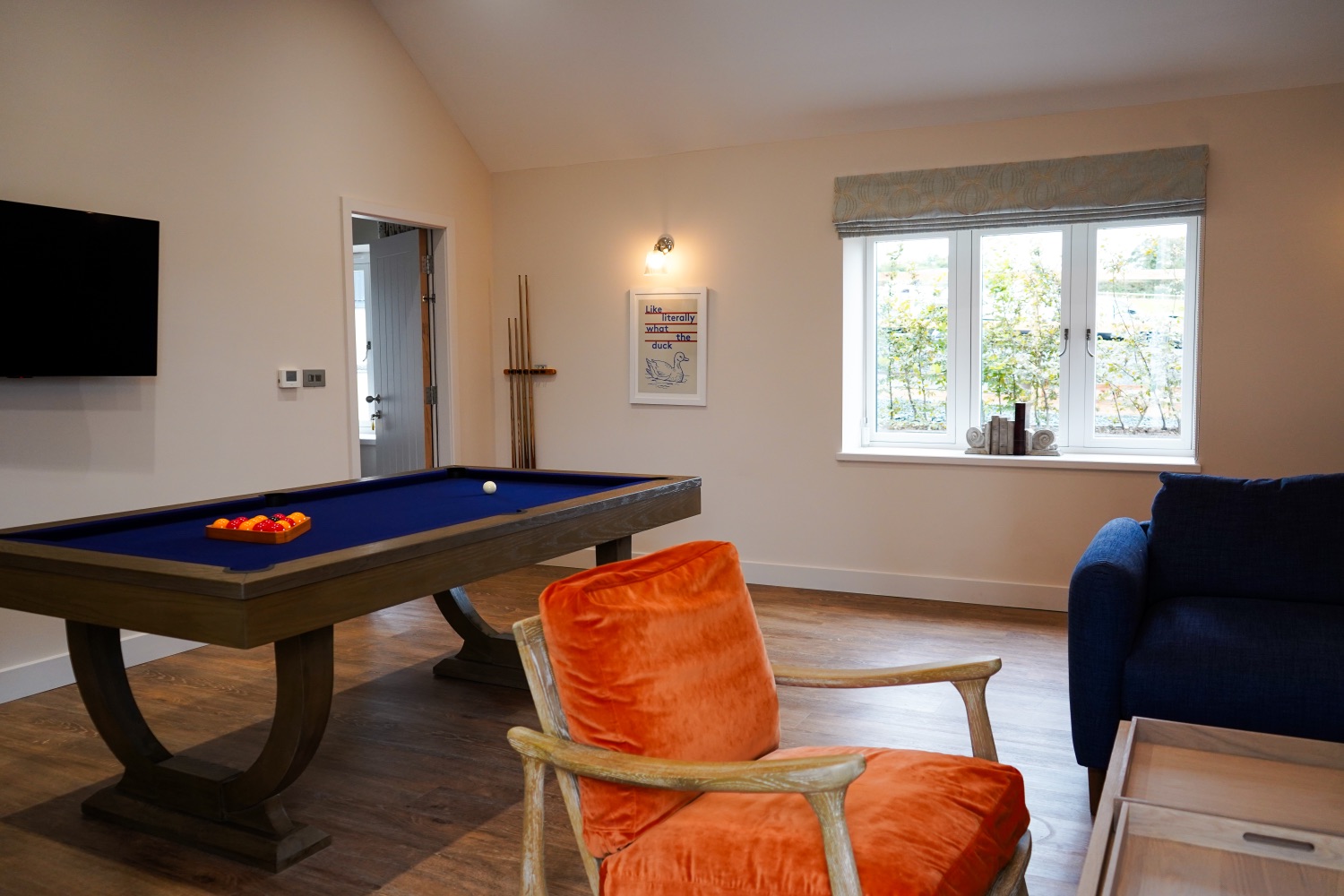 This building used to house the milking parlour for a dozen cows.  George remembers as a child the daily milk churn collection from the top of the drive.  More recently it was used for rearing calves.  This four bed ensuite accommodation with a pool table and kitchenette has become a popular alternative to the The Dressing Room.  The large terrace with a couple of benches catches the afternoon and evening sun.